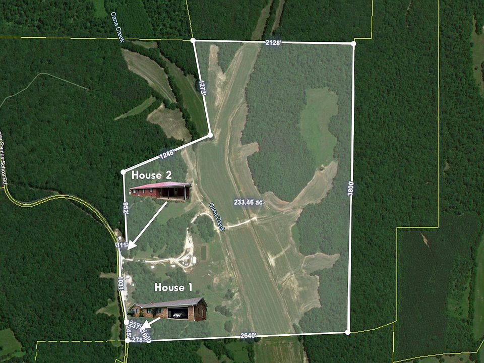 230 Acre Farm with 2 houses on it. Both Houses in really good shape! 45 to 70 acres row crop income for 2022 was 10k. 4 Grain bins, Large 100x50 Storage Pavilion and a couple barns. 1882 sqft in the larger home with a 1500 sqft basement built in 1982. 1120 sqft smaller home built in 1967. Each home could be rented for additional income or you can bring the Family. Well water supply to one house and the water tanks. Big Income Potential! Call today for more info! The extra room measurements are for the second house and the letter at the end of the measurement is the first letter of the type of room.