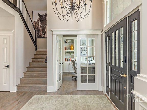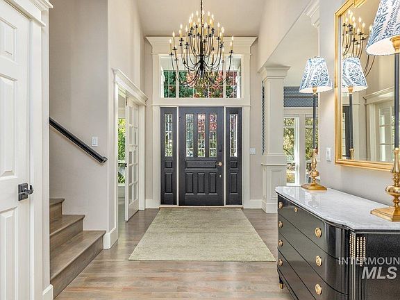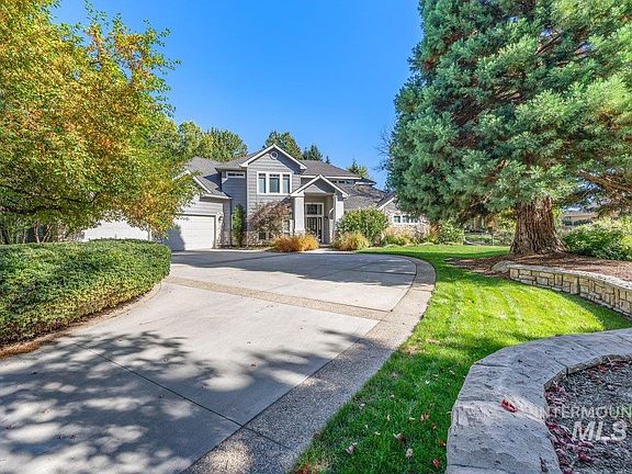 This elegant home exudes curb appeal & is perfectly situated on a stunning 1/2 acre lot near the Boise River Greenbelt! Professionally landscaped, this property sits next to a serene common area with a tranquil pond. Set on a sprawling half-acre, the yard is a private oasis filled with lush gardens, mature trees, and visits from birds & wildlife. Step into the stunning kitchen, equipped with a Wolf range, wall oven, microwave drawer, beautiful quartz countertops, a large island, butlers pantry & custom cabinetry with ample storage. The breakfast nook leads into the family room, where vaulted ceilings and a grand stone fireplace sets the stage for cozy gatherings. The main-level master suite features a fully remodeled walk-in shower, double vanities, & a walk-in closet, plus an exercise room. With a spacious 3-car garage & ample built-in storage, this home is as practical as it is beautiful. An exceptional place to live, relax, & entertain and walking distance to restaurants, coffee shops and the Boise River!