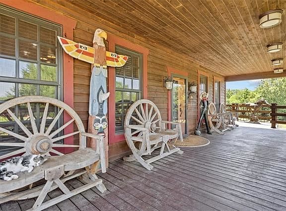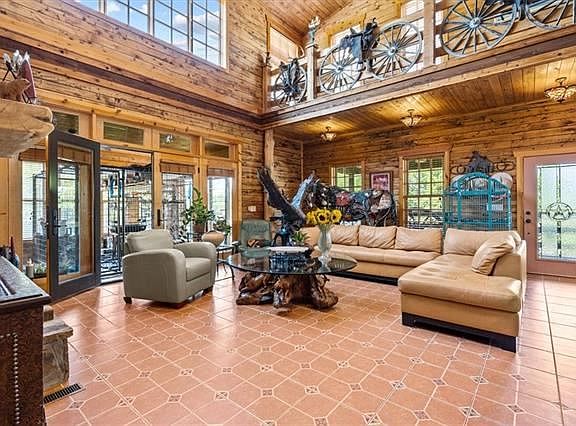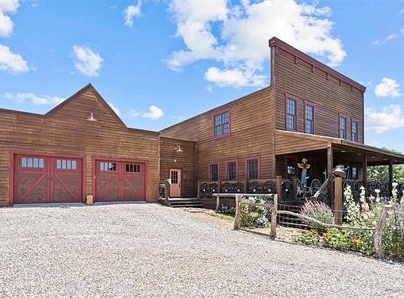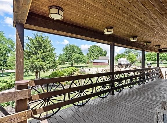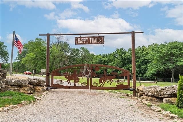 One of a kind homestead! Custom ranch home sits on roughly 12 acre, conveniently nestled in the trees. Just a few minute drive from Leawood and all major conveniences. When entering through Happy Trails custom metal gates, driveway passes horse barns, perennial flowers to the circle drive with stone waterfall, horse and wagon. The home welcomes you with covered porch and wagon wheels. Throughout the home is tongue-and-groove aspen ceilings and walls. Mexican tile throughout the home for easy cleaning. Two primary suites, stone fireplace, saloon doors, soaring ceilings, and sun room! Upstairs features a balcony that can duo as office and/or sitting area with wet bar. Primary bath boasts of entry less stone shower with waterfall feature and clawfoot tub. First floor primary room has cozy stone fireplace, walk-in closet, and doors to sun room. Open kitchen and great room with soaring two story ceiling and stone fireplace makes for great entertaining. Set up for main floor living! Finished basement has a family room with wet bar/kitchenette, full bath, one conforming room and one non-conforming room. Property lined with fence and spring fed creek is ready for your horses or animals! This property is perfect oasis for someone who loves wildlife!