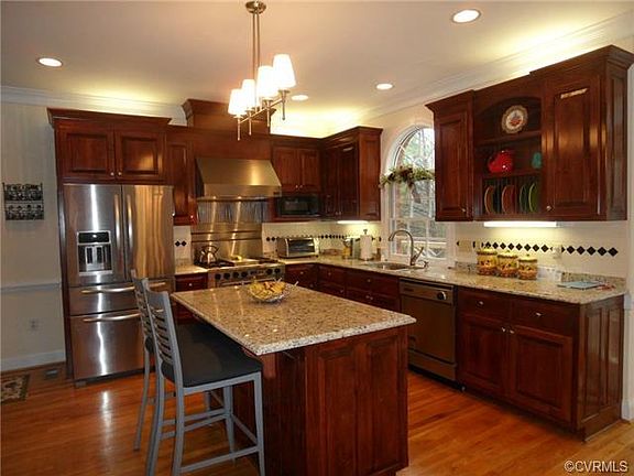 This house is solid and you can feel it as soon as you walk in! All brick home with full basement and a walk up attic with plumbing roughed in for even more expansion. Perfect storage! Enjoy the open feel as you enter the home with the 9' ceilings and hardwood floors on the 1st floor. Formal rooms for easy entertaining are large and open to each other, butlers pantry between kitchen and dining and a large gourmet kitchen with granite, commercial gas range with convection oven, trash compactor and custom cabinets with lighting over and under! Desk area in kitchen, back hall to garage and a guest bath off foyer. Nice breakfast area with door to deck. An extra large screen porch is just off the kitchen and open to deck also. Kitchen is open to huge family room with gas fireplace. The 2nd floor has 2 masters and 2 additional bedrooms. You will love all the closets! 1s master has 4 closets and 2nd master has 2 closets. Basement is great for entertaining family and friends. Brick wood burning fireplace, a wet bar, cabinets, full bath with shower, utility, and exercise room. Central vac. Great location near golf, shopping & restaurants. Chesterfield schools, minutes to Rt. 288.