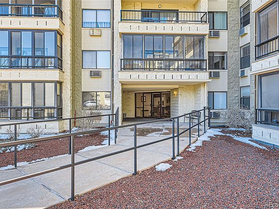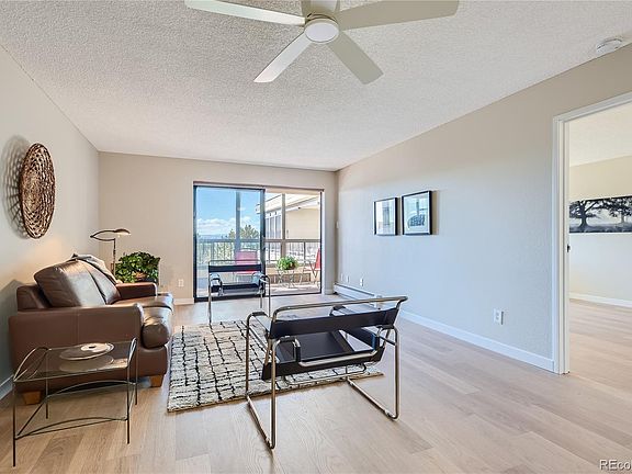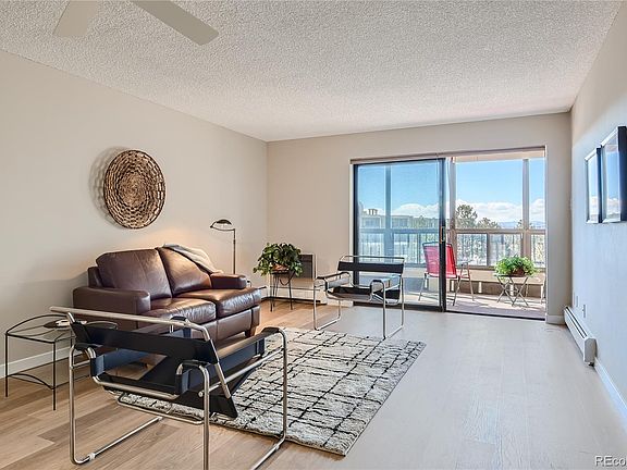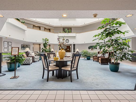 Sought after Atrium bldg 1 bedroom/1 bath condo with great views of mountains and front range. This is the top floor, so no one is above you. Lots of upgrades including laminate floors, tile floors in the bath and laundry room, white cabinets in kitchen and bath, subway tile backsplash in the kitchen and deep stainless sink, quartz countertops, stainless appliances, paint, circuit breaker box, ceiling fan, thermostat, lighting. Neutral colors throughout. There is a screened in lanai with roll down blinds and partial glass that has a terrific mountain view...practically speaking almost an additional 100 square feet of living space. The bedroom has a large walk in closet, 6'1"x5'4". The stack washer and dryer are in an ample laundry room, 5'10"x3'3". There is a trash chute close by and a storage closet (6'4"x3') on the fifth floor. There is one secured, deeded underground parking space, #23. This Atrium building has TWO elevators, so it cuts down immensely on waiting time. Heather Gardens is a 55+, non-smoking community. This community includes a huge clubhouse with onsite management and an on site restaurant, Rendezvous, an Executive golf course and pro shop, tennis and pickleball courts, indoor and outdoor pools (with lanes), jacuzzi, sauna, wood working shop, very large and modern fitness facility, craft classes and clubs (pottery, book club, water aerobics, woodworking, etc) and so much more. And don't forget, you are just minutes away from Cherry Creek State Park and Reservoir, I-225, public transportation, Nine Mile Park and Ride, King Soopers, shopping and restaurants. RV parking is available to rent. Come see this one....sit back, relax and enjoy all of the things this community offers.