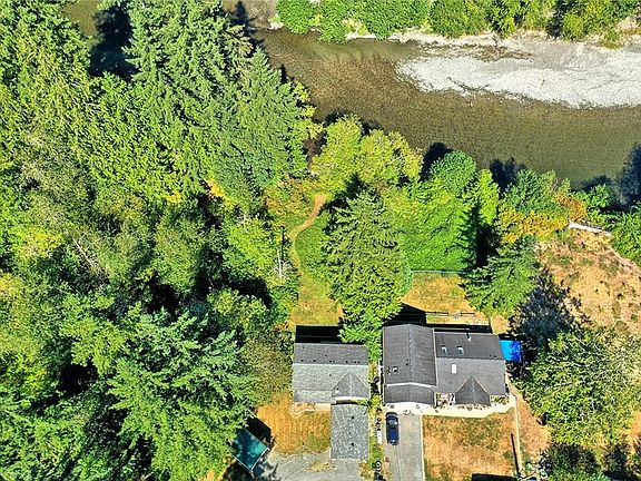 Charming & rustic w/pine floors & river rock fireplace. Kitchen has island w/eating space & window to the view.. 75 feet of medium bank waterfront. Located in Jordan River Trails Community w/ beach rights, community pool, club house & the privacy of being at the end of a paved cul de sac. This home is well maintained w/ newer exterior paint & a retractable awning over the deck. Dog friendly fenced back yard. Two carports for RV parking. Covered front porch.