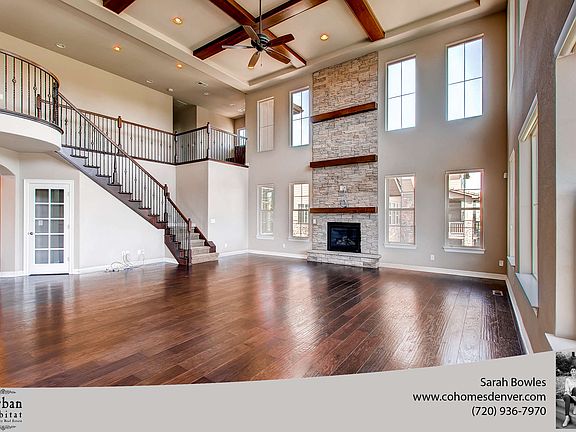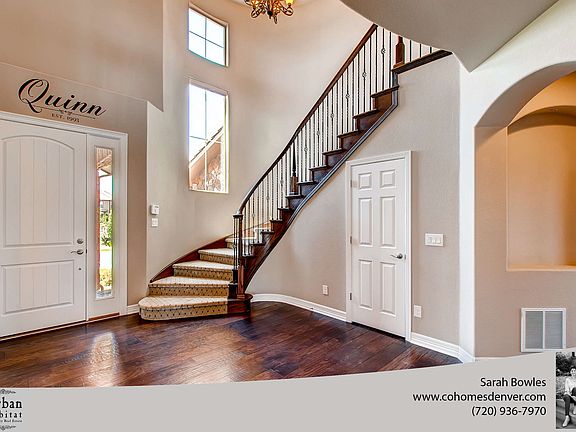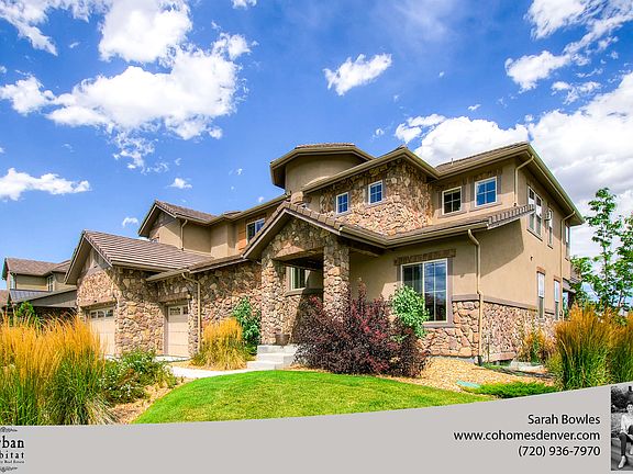 This gorgeous luxury home in The Preserves at McKay Shores in Broomfield is nestled on one of the largest lots in the neighborhood. A walking path just out the back door leads to the tranquil McKay Lake. This impeccable home has been updated with custom designer finishes with meticulous attention to detail. Entering the home is a stunning foyer with soaring ceilings and a beautiful spiral staircase. This home has superior craftsmanship and unsurpassed quality throughout the home with wide-planked floors and walls of windows to let in an abundance of natural light. The great room has a beautiful fireplace with natural stone and exquisite boxed wood beams. The chef's kitchen has updated quartz countertops, custom cabinets, and stainless steel appliances. The master suite has a beautiful outdoor terrace that is great for reading the morning paper and sipping coffee. The oversized walk-out basement boasts a large wet bar, theatre room, and two additional bedrooms. This home has it all.