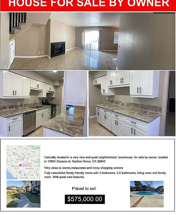 Centrally located in a very nice and quiet neighborhood. Very close to stores, restaurants, and many shopping centers. Fully remodeled family-friendly home with 3 bedrooms, 2.5 bathrooms, living room, and family room. With great new features. New contemporary kitchen includes New stove, New dishwasher, New modern cabinets, New remodeled bathrooms with marble tiles, New water heater, New mini blinds, New top quality tile, Spacious bedrooms closets with mirrors, Fireplace, Double car garage, Hooked laundry washing and drying machine, Central air condition, Nice backyard with a lemon tree. Community recreational area with community pool and jacuzzi and sauna. Furnished area to hold parties and events. Walking distance to blue ribbon elementary school.