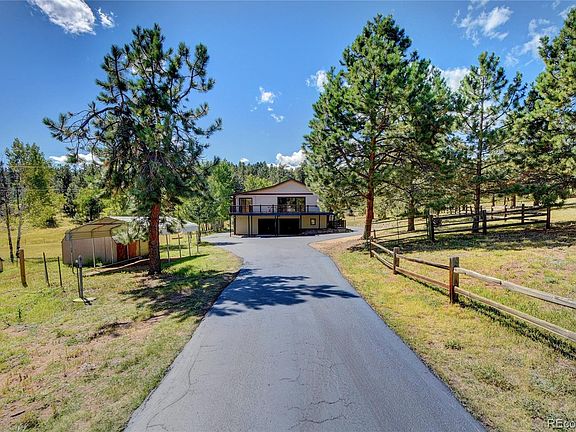 Live in the mountains with an easy commute to Denver 1/2 mile to Pine Junction/285!! 9.7 acres of flat beautiful HORSE PROPERTY with amazing Mountain VIEWS of South Platte Valley!! The remodeled kitchen has custom cabinetry, new stainless appliances, and granite countertops, large island for entertainment. Adjoining the kitchen is a seating area with a fireplace. Spacious bedrooms, Remodeled bathrooms, new flooring! Handicap accessible lower level In-Law apartment complete with kitchen and locked off from the upper home = INCOME POTENTIAL. Oversized 2 car garage is heated, 4 carport spaces. Large heated workshop. Hand Pump provides water for horses + livestock. Well (permit 98687); 4 FENCED lush Pastures/meadows: 3 loafing/2 tack sheds. Newly Paved Driveway. Passive Solar warmth of 415 SqFt SUNROOM with skylights. Metal Siding + Roof. Huge new TREX Deck is Inviting yet secluded to expand your living space outdoors. No covenants or HOA. JeffCo schools. Forested Acres are Fire Mitigated.