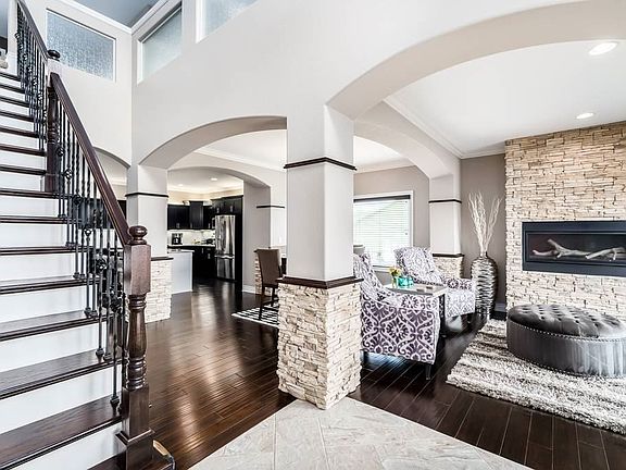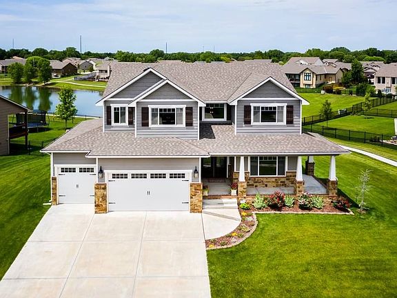 Come see this beautiful, custom-built home that wonderfully combines contemporary touches and luxurious amenities with a smart layout. As you enter through the tall double doors, you will notice how airy and bright this home is. The main floor features ample entertainment space that opens up to lovely lake views and a tranquil backyard. Notice the many upgraded features and details such as the stone pillars, a contemporary fireplace and the beautiful hardwood floors. The elegant kitchen offers granite countertops and high quality cabinetry with tons of space, along with a walk-in pantry. You will also find the laundry room and a highly-desired mudroom on the main floor, adjacent to the garage entry. The second story contains four bedrooms including the spacious master suite, and offers a peaceful refuge away from the main level living spaces. The master suite includes a large walk-in closet, and bathroom including a walk-in shower and jacuzzi tub. All of the other bedrooms have their own walk-in closets which provide ample storage space. There is also a loft which is perfect for a home office. You will find more entertainment space in the basement with a sit at bar and a dazzling theater room that you could quarantine in for days!