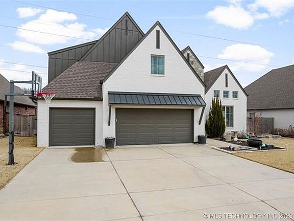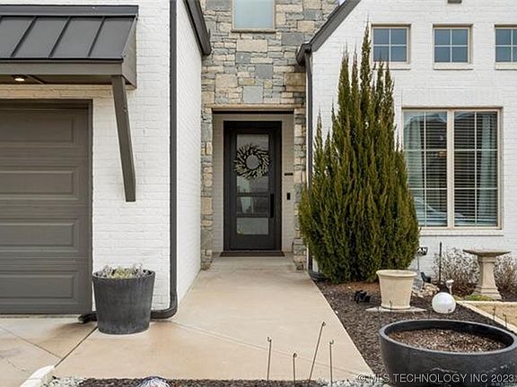 This beautiful newer built modern farmhouse features a wide open floor plan w/ soaring ceilings & designer finishes. Located in popular Dutchers Crossing with an incredible greenbelt view. Enjoy the peace and quiet of the covered patio with pergola and outdoor fireplace as you watch the wildlife pass by. Spacious vaulted living room with beams accenting the space. Many windows allow ample natural light to stream in. Gourmet kitchen w/ generous dining space. Primary suite w/private bath flows to laundry. Guest bed w/private bath down or office. 2 beds & Game room up. Bixby West schools