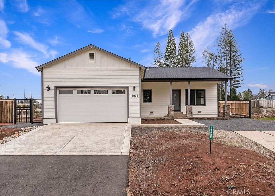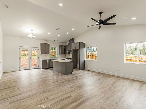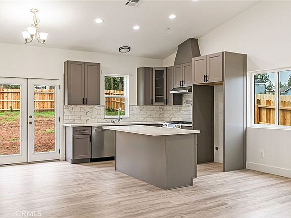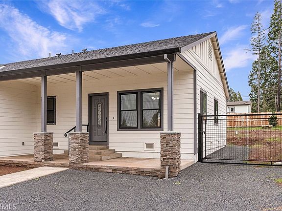 This 1284 sqft, **new construction** is a blend of elegance and design, offering a comfortable living experience. As you approach the house, you'll be greeted by the charming front porch adorned with stone accents on the pillars and across the front concrete slab, creating a welcoming entrance. The exterior boasts black frame vinyl windows and an additional parking pad. This spacious .23-ac. lot has a fully fenced backyard ideal for entertaining or a peaceful retreat. Inside you'll discover the spacious open floorplan, with luxury vinyl plank floors and attractive lighting fixtures. In the kitchen you'll find a wall-mounted pot filler and stainless steel appliances, a propane stove/oven, marble countertops, and a large kitchen island with bar counter. Meal prep in this kitchen will be a delight. Double glass doors lead from the dining nook to the backyard, seamlessly connecting indoor and outdoor living. The secondary bedrooms are flooded with natural light from bright windows and boast lovely modern light fixtures. The guest bathroom is adorned with tile floors, marble counters, and a shower over tub. The master bedroom is a retreat of its own, with large windows, recessed lighting, and a ceiling fan for comfort. The walk-through closet provides ample storage space, leading to the master bathroom featuring tile floors, marble counters, double sinks, and a luxurious marble tile step-in shower. An indoor laundry room is complete with wooden countertops, cabinets and a stylish floating shelf. The 2-car garage has a side-mounted door opener, sprinkler timer and additional 220 wall outlet. Central heat and air make this a dream home for year-round comfort. Conveniently located less than a mile from the grocery store, multiple shopping options, post office and dining! Plus, it is a quick and easy commute down Skyway to Paradise & Chico. How about fishing & water sports and outdoor adventures? This lot is a short drive to Paradise Lake, DeSabla Lake, Lake Oroville Marina or the Feather River! Enjoy the benefits of being in the Paradise Pines Property Owners Association as well. You are only a short drive the clubhouse with association amenities including the clubhouse with meeting rooms & library, 2 event centers with full kitchens, full bar & lounge at clubhouse, tennis courts, bocce ball court, children's playground, hiking trails, swimming pool & spa and so much more!