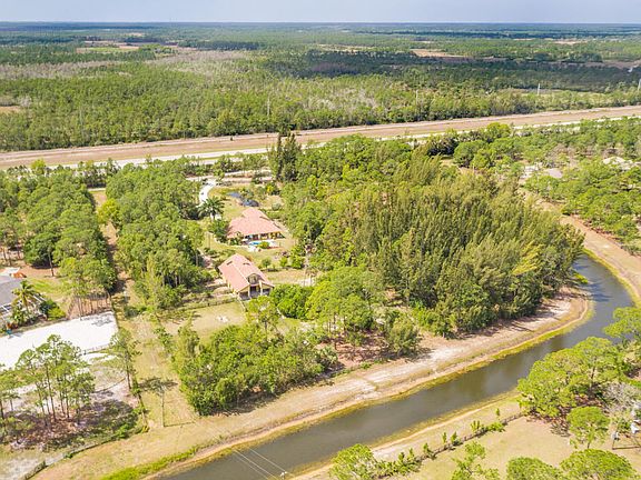 Extraordinary & luxurious, 5BR/41/2BA + 1BR/1BA apartment, CBS home surrounded by over 5 lush wooded acres with water on 2 full sides located on a private cul-de-sac in the highly sought-after equestrian community of Caloosa. This incredible, wide-open home is great for entertaining and has 24" Travertine flooring laid on the diagonal, massive windows, modern light fixtures, a gourmet chef's kitchen with solid wood cabinets, granite countertops, walk-in pantry, wine refrigerator, and a Wolf 4-burner + griddle stove, spacious master suite with dual walk-in closets, and an amazing outdoor living area with a pool, covered patio, outdoor kitchen, and a pond. The barn is the best in the neighborhood and has 6 stalls, fenced-in pastures, and an apartment above. The front 4 acres have irrigation.