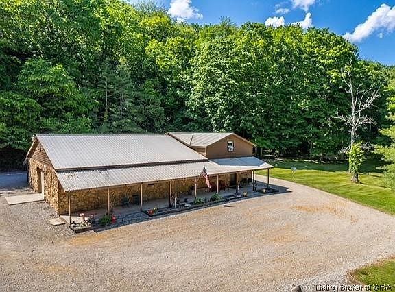 THIS IS A RARE FIND.....This park like 9.22 surveyed acres sitting across from the The Charlestown State Park includes a custom built mini ranch with a gated entry. Property is a wildlife paradise. Property boasts a stone pole barn house with 1425 sf & attached 32 x 40 garage for all your toys. Guest house features 1500 sf main area/unfinished area. Both homes offer front covered porches for entertaining.