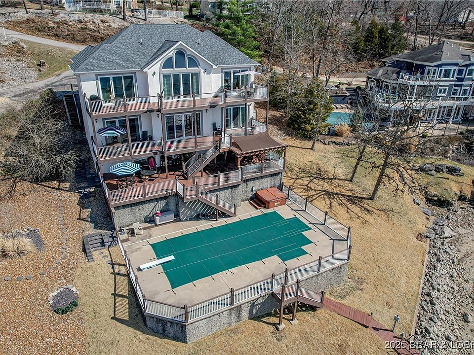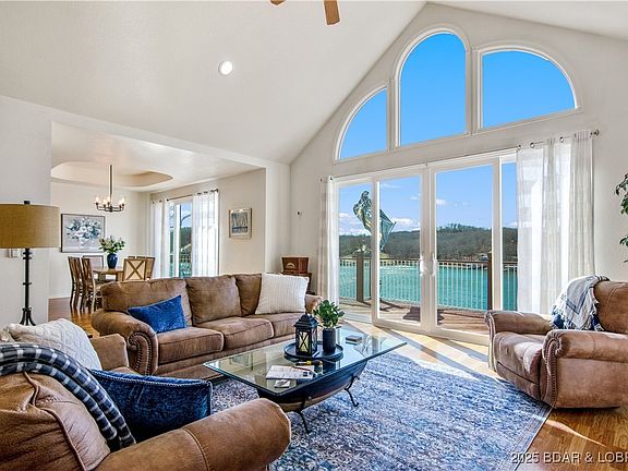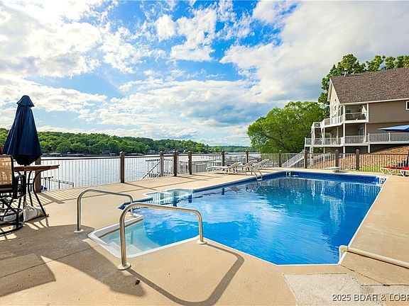 Lakefront home with wonderful views, a private pool and over 100 feet of cove protected waterfront. Great cove setting with deep water and elbow room between neighbors. Current dock has a 18X40 slip but there is plenty of room to get the dock you have always wanted. This is a large home with 4 bedrooms, a great 3 car garage and nearly 4,000 sq ft. Parking isn't an issue and this location (The Boulders) is wonderful being located conveniently close to Osage Beach and all of its amenities. This is a wonderful lake home that is built for fun and entertainment. Beautiful entry with large lakeside windows, vaulted ceilings and a spacious foyer/living area. The kitchen, dining and primary suite are all on the main level with 3 additional bedrooms on the lower level. All of the bedrooms are large with an exceptionally spacious primary suite. The lower level has a built in bar area, game area and great storage in the utility room. The outside area is what will really sell you! Big decks, great views, an outside bar area with a half bath and a relaxing lakeside pool/patio. Home also comes furnished and includes the 3 well dock. This is a quality home on a nice lot in a great cove!
