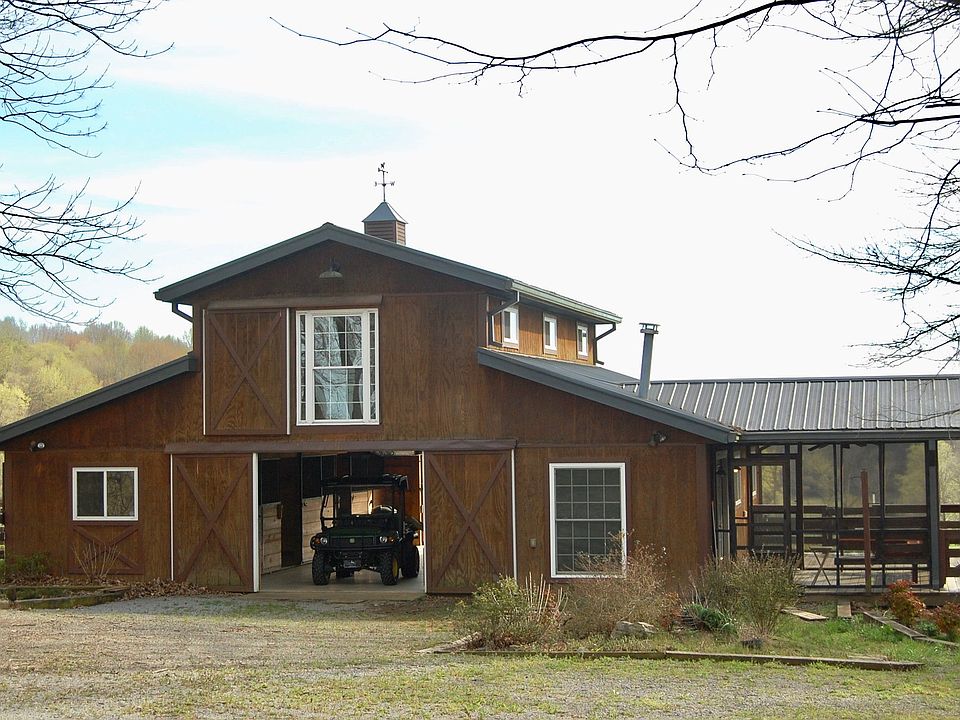 Beautiful, rustic barn-home on approximately 32.75 acres on Ramble Creek---private, but close to town. Almost 2,200 square feet under roof with a large breezeway and three pristine horse stalls. House part of building is currently 2 BR and 1.5 bath with screened porch plus deck, but easily expanded. Central heat and air. Four separate fields with woven wire fencing immediately ready for your horses or cattle. Almost new 36 X 48 machinery building. Partially wooded with marketable timber on property. Possible owner financing with 25% down payment. Call Charles Freeman at 270-846-9470 between 10:00 AM and 10:00 PM. No texts.