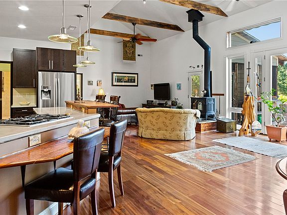 The very private main residence features an open floor plan, meticulously designed with every detail considered. The large great room has panoramic views of the river, soaring ceilings, and a rustic wood-burning stove, casting a cozy ambiance for those crisp winter mornings. A culinary haven awaits in the kitchen, replete with double ovens, a raised dishwasher (avoid having to bend down to get your dishes!), wine chiller, and ample Corian countertops and two breakfast bars. The owner's suite is a private oasis with private deck access for those leisurely mornings, a spacious walk-in closet, and an ensuite master bath with exquisite tilework, a luxurious soaking tub, and a rejuvenating shower with multiple heads. Additional bedrooms, including a versatile home office with built-ins, offer ample space as well.