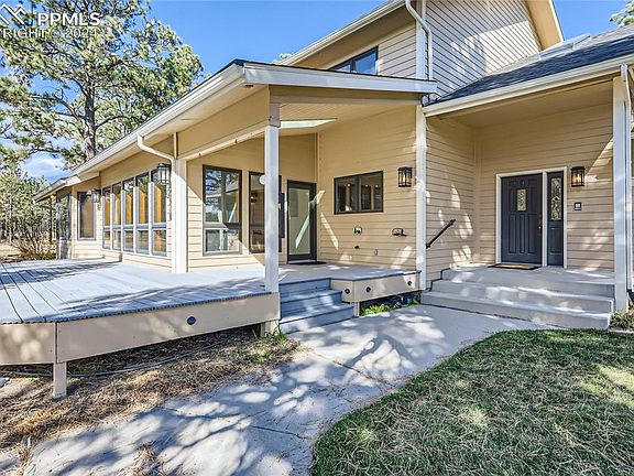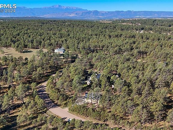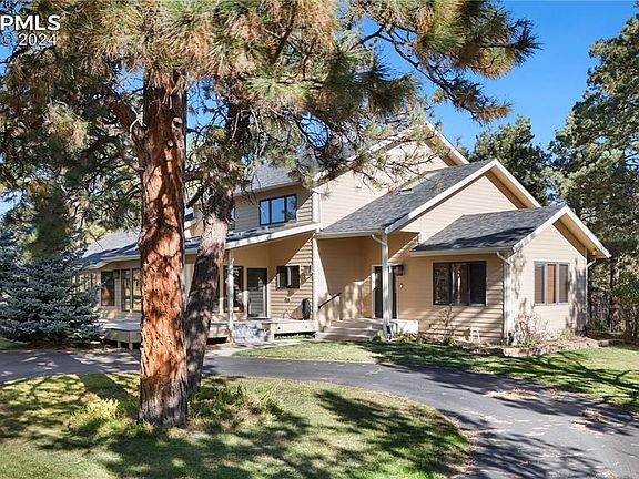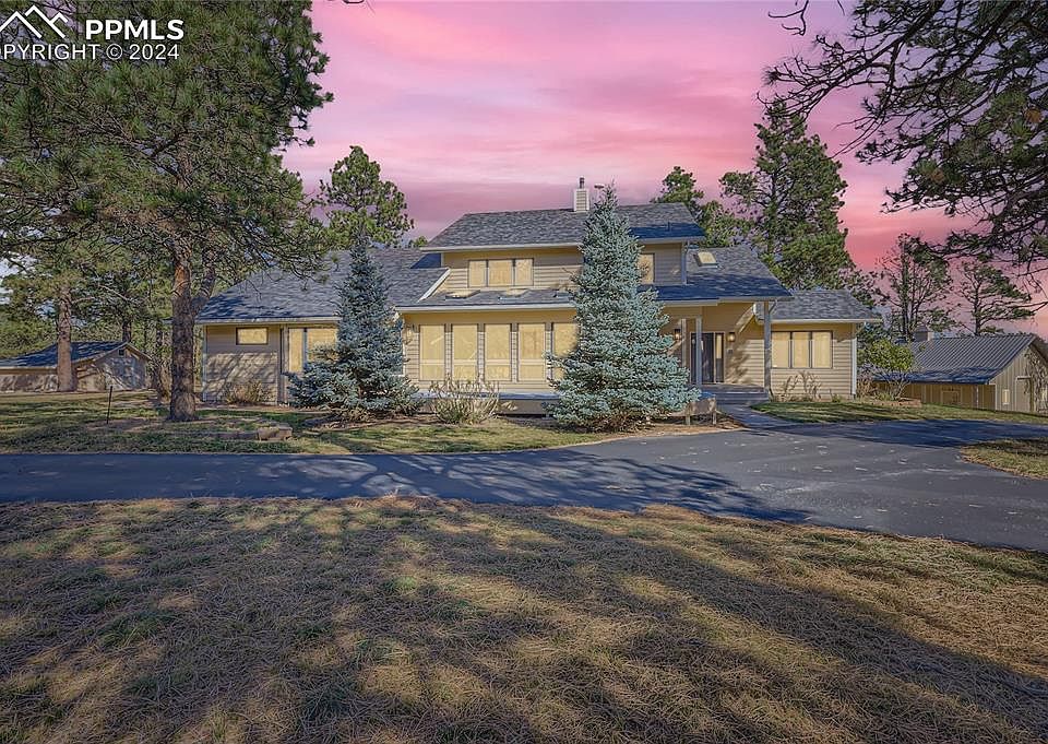 Amazing Black Forest 3800+ 1 1/2 story home on five treed acres with four bedrooms, four baths, all main level living, with three car attached garage with oversized & heated 3rd bay plus attached heated 24x30 shop area, making this perfect for home business/hobbies. PLUS a fabulous 30x40, drive through, multi purpose outbuilding w/6 ft overhang for hobbies/animals. Located on a beautiful lot with towering Ponderosa pine in School District 20, this lot is secluded with the home tucked away from the road. As you enter on the paved, circular driveway, you enter the home with all natural wood throughout the living areas and primary bedroom retreat. With a main level family room plus formal living spaces, the kitchen is the perfect place to gather with is updated decorating and large dining area plus pocket door that lead a four season sunroom which allows for more entertainment space. The 2018 updated kitchen features commercial grade Dacor range/oven plus a commercial grade Dacor refrigerator/freezer side by side unit. The beautifully appointed backsplash along with the quartz counters and custom birch butcher block counter on the eat-in island, 2 pantries, oak flooring, and under counter lighting. The main floor also features a wonderful primary retreat with oak floors, a sitting area, plus a brand new spa-like bathroom with new tile floors, oversized shower, new vanity/mirrors/lighting with double closets w/custom closet systems. Then there is the large, dream laundry which walks out to the yard. The upstairs features three large bedrooms plus full bath with double vanities with one en suite bedroom perfect for guests.Other amenities include LED lighting, new 50 gal HWH, home intercom, house vacuum, water recirc, upgraded plumbing fixtures,both elec and gas dryer hook-ups,newer roof/skylights, custom steel yard fence w 8" concrete block, additional shed w/elec. expert landscaping/terracing. No HOA, minimal covenants, commutable to Springs and Denver. Come and enjoy!