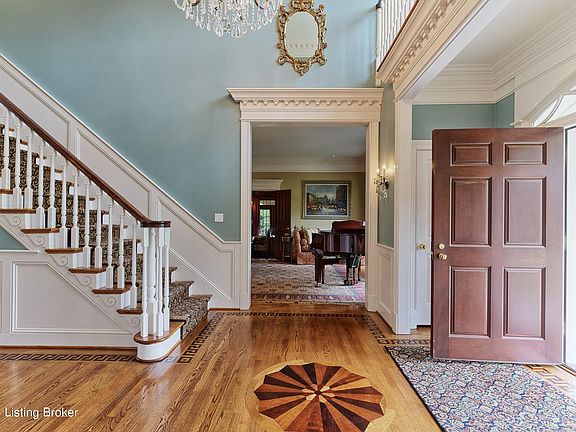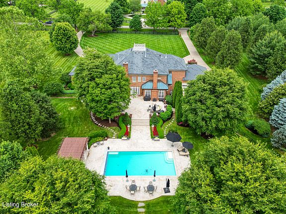 Welcome to this breathtaking 5-acre estate in Prospect's River Glen neighborhood, thoughtfully redesigned for modern living by local architect, Tim Winters. The expansive front yard sets a grand stage for this classical Georgian style home, leading to an impressive entryway featuring hardwood flooring with beautiful inlay detail. Promising an extraordinary living experience for those with discerning taste, this home provides a lifestyle of unsurpassed luxury and distinction. A sitting room off the foyer provides a wonderful space for greeting guests and hosting more formal occasions. The open-concept kitchen is equipped with state-of-the-art stainless steel appliances, a central island, and an eat-in area featuring a gas fireplace. The dining room boasts exquisite crown molding and meticulous craftsmanship, ideal for hosting elegant dinners. The seamless flow continues into the grand living room, with its coffered ceiling, an additional gas fireplace, and double French doors that open to the outdoor paradise. A chic wet bar and discreet half bath located in the center of the home add convenience for entertaining and daily living. The first floor also offers a stunning two story combined office and library space with rich wood paneling and built-in shelving. A screened in porch with Brazilian hardwood flooring and an outdoor loggia with elegant arch designs enhance the home's entertainment potential and exudes luxury, and is sure to impress the most discerning buyer. Upstairs, the primary suite serves as a private haven with a custom walk-in closet and luxurious ensuite bathroom, complete with heated floors, dual shower heads, twin sinks, and charming window seats. This suite opens onto a circular library that extends to the outdoor deck seating area, offering seasonal panoramic views of the Ohio River and the meticulously maintained grounds. Three additional bedrooms, each with a walk-in closet and full bathroom, provide private accommodations for family and guests. The lower level includes a theater room connected to an Entertainment Room with a wet bar, ideal for hosting movie nights or game nights. Additionally, a workout room, a flex room, and a full bathroom with a steam shower completes the lower level. Practical amenities such as a three-car heated garage with direct kitchen access, a comprehensive laundry room with ample storage and a utility sink, and an additional half bath off the garage, ensure convenience and functionality. The backyard of this property is a true oasis, offering a perfect blend of relaxation and entertainment. Directly accessible from the living quarters, a sprawling limestone patio surrounding the pool not only enhances the aesthetic appeal of the property but also significantly extends the outdoor living space, offering multiple seating areas. At the center, lies an inground heated pool, which serves as the focal point for gatherings. A carefully placed pergola creates a picturesque setting ideal for al fresco dining or leisurely afternoons. This area is beautifully set against the backdrop of the spectacular lawn. Equipped with an irrigation system and a whole house generator, this impeccably maintained home is not just a residence but a luxurious retreat, offering an unparalleled lifestyle of comfort, elegance, and privacy, perfect for those who cherish the pride of homeownership and the joy of entertainment.