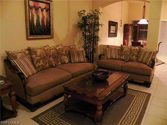 Reflection Lakes centrally located to everything in Fort Myers that matters. This spacious, tastefully furnished 2nd floor 3 bedroom, 2 full bath coach home has lots of natural light & vaulted ceilings. A great winter retreat or full time home with a tiled living areas, new carpet in master & on the stairs, upgraded ceiling light and fans, wood cabinets and solid surface counters in the kitchen, kitchen pantry, split floor plan, new faucet, new high end Samsung washer and dryer inside the home, a screened lanai just off the kitchen with a garden view and a one car garage. The Reflection Lakes Community is close to Sanibel Island and Fort Myers Beach, Barbara B. Mann Theater, walking & biking distance to Lakes Regional Park, our local colleges& grade schools, fantastic shopping, dining & entertainment and RSW International Airport. The community has two clubhouse with scheduled activities, community gathering rooms, tennis courts, two fitness facilities, basketball & volleyball courts, and two swimming pools. 2 pets allowed.
