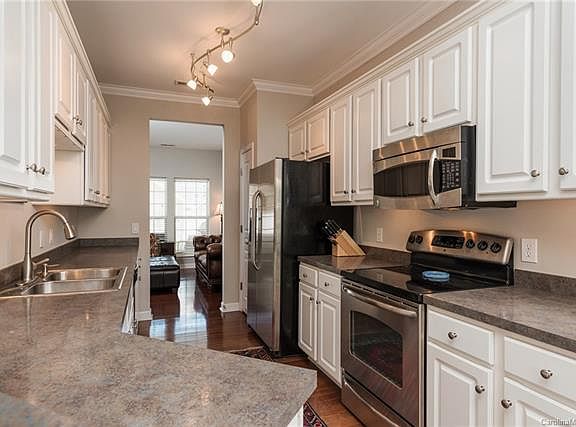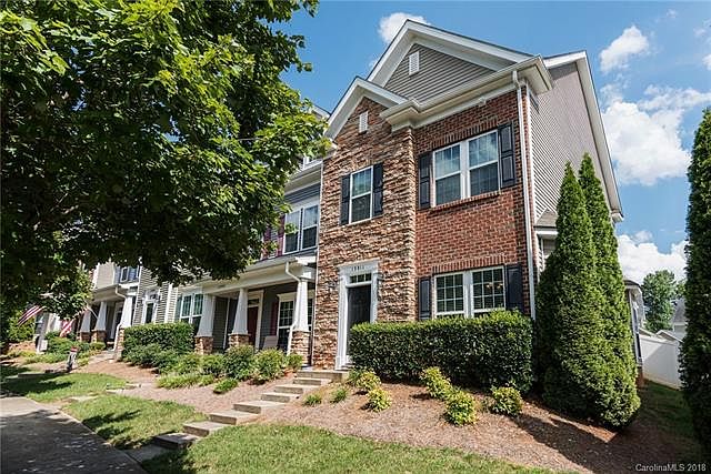 Beautiful Townhome in Carrington Ridge. Very Desirable End Unit w/Handsome Brick & Stone front facade, Lots of windows & spacious rooms. Main floor offers wood floors throughout, dining room, Great Room w/bay window, ceiling fan & fireplace. Bright Kitchen w/White cabinets, SS Appliances, pantry, & lots of counter space. Breakfast bar + under cabinet lighting w/indirect above cabinet lighting. Great entertaining floor plan w/covered back porch overlooking nicely landscaped, fenced rear yard. Master BR has tray ceiling, walk-in closet, & ceiling fan. Bedroom two has double windows & walk-in closet. Huge 3rd floor bedroom/bonus room w/walk-in closet & private bath. Third floor also has large utility closet plus attic storage. Home is located less than two blocks from the beautiful pool, pavilion, and playground.