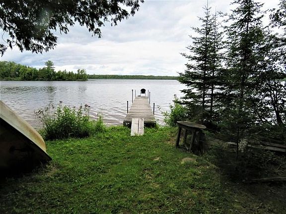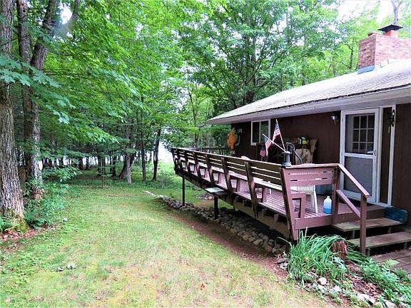 Your very own Bridge Over Troubled Waters! This unique Turtle Chain of Lakes property features a wooden foot bridge over the stream that meanders down to your 100 feet of west facing level ripple sand South Turtle Lake shoreline, with a pretty island view. Even better, the LR of the 3BR 2BA home affords a lovely treehouse-like view of the stream and the lake frontage through a wall of windows. The main level of the home consists of the LR/dining area. kitchen, full bath, and 2 bedrooms. The LR features a wood burning brick FP, and opens onto a wrap-around deck. The LL provides two exterior entrances, a bath, utility area, and a bedroom and a sleeping area. Outside you will find a two car detached garage and small chicken coop - start your day in the Northwoods with fresh eggs! This home is in a great location for access to paved AND mountain bike trails, downhill and X-C skiing, snowmobile trails, and, of course, there is the LAKE!