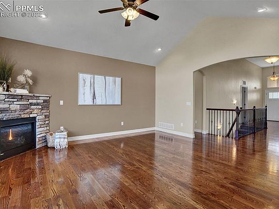 This beautiful stucco home has a luxury feel with many upgraded features! Hand-troweled walls, 5" baseboard molding, coffered ceiling in the office (or formal dining) area, wood floors throughout most of the main level, 9' ceilings, decorative iron railing, and an OnQ smart home system. The desirable floor plan is open concept that has a great room with wood floors, vaulted ceilings, gas fireplace, with attached kitchen and dining area. The large kitchen has granite countertops, tile backsplash, stainless steel appliances, kitchen island with bar stool seating, and a spacious pantry. The main level has a room adjacent to the kitchen that can be used as either an office or formal dining area. The primary bedroom is on the main and has luxury plank flooring and a double-sided gas fireplace that can also be enjoyed from the jetted tub. The master bathroom has a spa-like huge custom shower, jetted tub, double vanity with granite, and large walk-in closet. Additional main level bedroom and full bath on the main floor. The finished basement with 9' ceilings has a huge additional family room with surround sound, as well as a full wet bar with granite countertops, refrigerator, dishwasher, microwave, and plenty of cabinet space. Two more roomy bedrooms in the basement share another full bath. This amazing home has tons of storage space plus a 3 car garage, and front range mountain views from the back patio! Large grassy backyard has a park-like feel. Past owners installed an invisible dog fence, though not used by the current owner. The quiet neighborhood is small and upscale and is in a fantastic location in north Colorado Springs and School District 20.