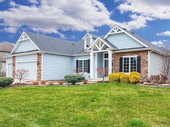 Stunning four bedroom ranch with full basement located in the well-desired and beautiful neighborhood of Bridgewater! Make way through the inviting foyer into the formal dining room and spacious great room, featuring a grand coffered ceiling and two-way gas fireplace. Just beyond the great room and off the breakfast area sits the bright sunroom, surrounded with windows and tranquil views of the pond. The perfect spot for enjoying morning coffee or relaxing around a cozy fire in the evening. The eat-in kitchen features a fine tile backsplash, granite countertops, built-in cabinet pantry, tons of storage and lots of counter space for serving or meal prep. Not to mention, new premium Kitchen Aid stainless appliances! The master bedroom has a gorgeous trey ceiling, large walk-in closet and pond view. The master bathroom includes a twin sink vanity and corner jet/garden tub. Bedrooms two and three round off the main floor and share a hallway bathroom that includes a nice sized storage closet. The basement is an amazing space with so many possibilities! The enormous rec room has space for game tables, entertaining and so much more. Not to be missed is the wet bar, beautiful theater room and a second fireplace. The fourth bedroom and another full bathroom are also found on the lower level. Recent updates include new water heater (2018), new sewage pump (2018) and new sump pump (2019). Other notable features of this home include a large open deck that overlooks the pond, built-ins, separate laundry, elegant crown molding and an oversized three car garage. What more could you ask for, schedule your showing today!