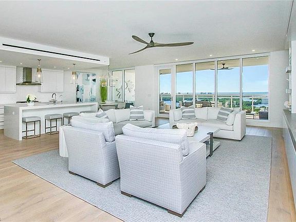 This remarkable 9th-floor Kalea Bay home is gorgeous, pristine, impeccable and offered turnkey. Kalea Bay is situated along the beautiful waters of Turkey Bay and the Gulf of Mexico with breathtaking Gulf and Bay views. An expansive open lanai with glass railings offers spectacular views and panoramic sunsets. The private entry elevator foyer opens to an extraordinary living space, featuring custom shiplap walls, amazing lighting, European wood floors, an open kitchen outfitted with Wolf and Sub-Zero appliances, quartz countertops and Downsview cabinetry. Meticulous, with an abundance of natural light, custom furniture throughout and original art adorning the walls, a spacious 4-bedroom, 4-bathroom floor plan features the finest materials, finishes and fixtures. Indulge in the rooftop pool deck and fitness room or head to the on-site Club at Kalea Bay with three separate pool areas, an outdoor bar, tennis and pickleball courts and a fully-equipped exercise room. Not to mention a casual bistro, gourmet restaurant and 12 guest cottages to complete the luxury resort lifestyle.