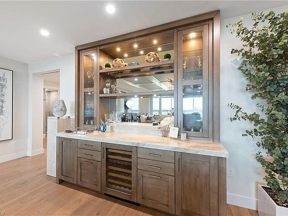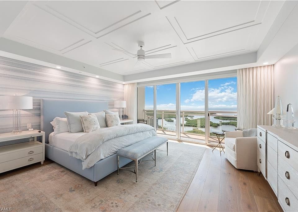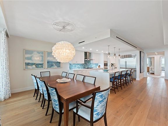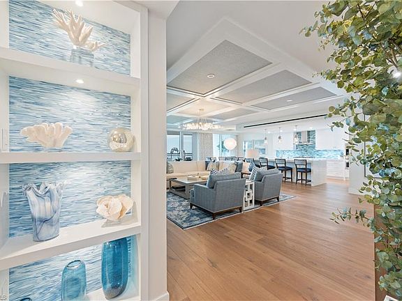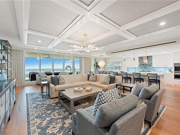 Rarely available Penthouse! designed by Lisa Kahn and featured in Florida Design magazine, this turnkey 4 bedrm 4 bath Penthouse offers refined architectural details, exquisite finishes,& a much sought-after private two-and-a-half car garage. Secured elevator access drops you right inside this welcoming floor plan featuring abundant natural light, European oak wood floors, expansive wide-open living spaces, & a generous oversized lanai. A natural flow connects the great room to the outdoors & showcases impressive views of the Gulf and marina. Entertainers will embrace the incredible gourmet kitchen with a Wolf Appliance package, including natural gas cooktop, Sub Zero refrigerator, and wine storage. The calming Mstr Suite provides sliding glass doors to view the gorgeous sunsets.Mstr bath has relaxing soaking tub, large shower and dual vanities. 2 guest en-suites include king-size beds and elegant finishes. 4th bedrm includes private balcony. Kalea Bay is the most sought-after condo development in Naples. With its resort 88,000 luxury amenity center, tennis and pickleball courts, three pools, two restaurants, outdoor and indoor bars, adult only pool, and a dedicated kids’ area.