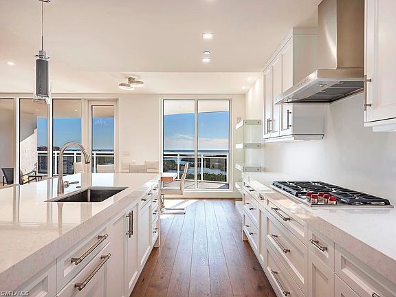 Breathtaking panoramic water views from this stunning 12th floor residence. Almost new and move in ready! Thoughtfully executed layout offers open living with high ceilings and floor to ceiling window walls. Beautiful wood flooring throughout. Open kitchen with breakfast bar, exquisite finishes, Wolf & Sub-Zero appliances, natural gas cooktop and adjacent butler's pantry. A dining area completes the space. All overlooking the water and the expansive open lanai with glass railings. Master Suite with walk in closet, spa-like bathroom with walk in shower and dual vanities. Two generously sized guest suites with en suite baths plus a den/4th bedroom with balcony and adjacent powder room. Coastal luxury at its finest! Tower 100 features a fob secured lobby, elevator opening directly into unit, unbelievable rooftop terrace with pool, lounge/seating areas, open air fitness center + garage parking. Community amenities include guard attended gated entry, amenity center with clubhouse, 2 restaurants, poolside dining & bar, resort pool, adult pool, kid's wading pool, fire pits, fitness center, tennis, pickleball, teen lounge, kid's game room, guest cottages, beach shuttle & more!
