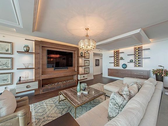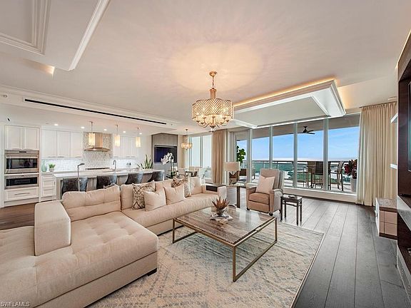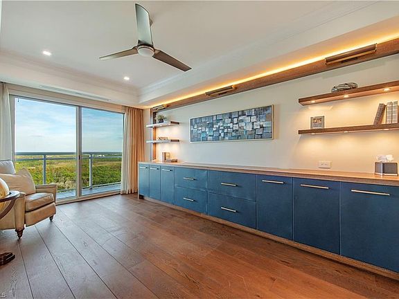 This fully furnished unit exudes traditional elegance. All guest rooms are ensuites in this 3 bdrm + den, with a beautiful powder rm. The extensive custom ceiling & built-ins highlight the generous living space. The 20th-floor views out the wall to wall windows is a haven for gazing at the Gulf and preserve. All standard millwork was replaced with custom moldings and doors. Every detail was carefully selected and quality crafted. Marble backsplash highlights the chef's kitchen and butler's pantry. Subzero and Wolf appliances, including natural gas cooktop. The divine master suite with massive windows overlooking the Gulf of Mexico & an opulent ensuite bath with soaking tub, glass shower, and separate makeup vanity. Two walk-in custom closets with glass door cabinets and drawers. Overly large open lanai with glass railings extends the seating area from inside to out. Highlights include custom built-in with leather-wrapped cabinets in den, Lutron lighting, and automated shading system, security cameras, & two assigned parking spaces within the upstairs garage. Rooftop pool and open-air fitness room, Kalea Bay, is the award-winning resort community where every day is a vacation.