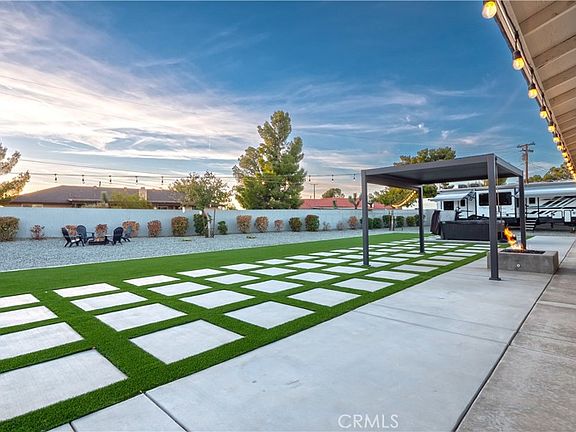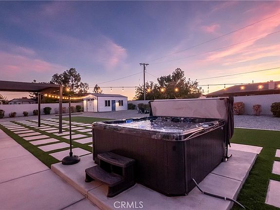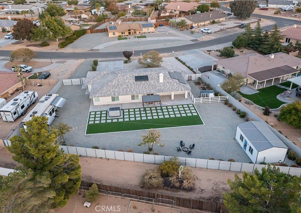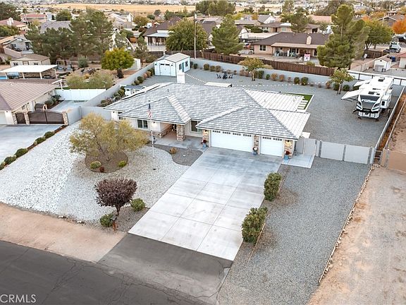 This exquisite single-story custom home, constructed in 2017, is nestled in the highly coveted Apple Valley area. The owners have invested over $70,000 in upgrades within the past year, which include a 26x16 detached Versa Tube garage featuring windows, doors, a remote opener, custom outdoor lighting, and a 50 Amp subpanel. The property boasts a fenced ranch-style garden with 4x8 raised planters and a chicken coop, alongside a brand new 10-person Cal Spa Jacuzzi equipped with its own 50 Amp breaker. Additional amenities include an RV plug-in with a 50 Amp outlet and a 60 Amp Tesla charger. Inside, you'll find new tile flooring in the dining room and all bedrooms, enhancing the spacious 2,220 square feet of living space that encompasses 4 bedrooms and 2.5 bathrooms, all bathed in natural light. Elegant shutters adorn the windows throughout. Upon entry, you are welcomed by a formal dining room that could also serve as a living room. The open and airy chef's kitchen features beautiful cabinets with self-closing doors and drawers, quartz countertops, stainless steel appliances, a walk-in pantry, and a sunny breakfast nook, all overlooking a large living room with soaring ceilings and a stunning raised fireplace. The popular split floor plan places the primary ensuite on one side of the home and three guest bedrooms on the other, while the indoor laundry room includes gas and electric dryer hookups along with ample storage. You’ll appreciate the wood-look tile flooring, crown molding accents, a tankless water heater, remote-controlled fans in the bedrooms, plantation shutters, and a spacious three-car finished epoxied garage. This property is energy-efficient with completely paid-off solar, and offers gated oversized RV, boat or trailer parking, an above-ground spa, ample space for a pool, LED outdoor lighting, durable fiberglass exterior doors, turf lawn with 2X2 concrete cut outs and much more. Additionally, it falls within the highly desirable Apple Valley Unified School District.