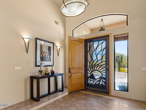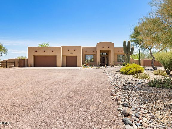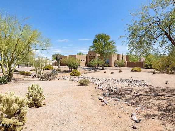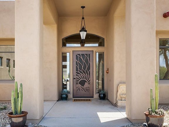 Experience the charm of this Santa Fe Territorial with detached casita! Featuring 8-ft knotty alder doors, lyptus cabinets and a large open living area separating the east and west wings. Kitchen is equipped with 2 hammered copper sinks, a rustic island, nook and an arched breakfast bar. Cozy up in your primary suite with an inviting fireplace, deep tub and closet that's big enough to be another bedroom! Take a hammock-snooze in the grassy area just outside the primary bedroom. Invite guests to stay in the casita. It's en-suite bedroom, living room, kitchenette and dining area will make them beg to stay a little longer. The saltwater pool, grotto, slide and waterfalls are perfect for entertaining. Framed by picturesque mountain views, this home truly showcases the beauty of Arizona!