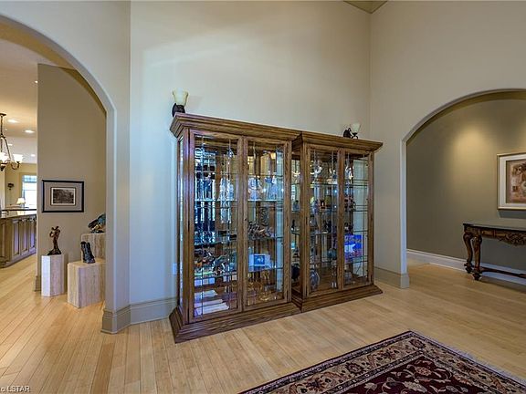 Spectacular executive home set against a panoramic backdrop of lush fairways, tranquil pond, a forest of mature trees along the crest of the horizon in the gated community of Riverbend Golf Club. Impressive custom home with stucco & stone exterior, compelling foyer w/ arched entries & soaring ceiling, natural light reflecting off the warm bamboo hardwood. 10 ft & 14 ft ceilings. Incredibly spacious floorplan boasts almost 3000 sq. ft above grade w/ approx. 2500 sq. feet of finished living in the lower-level walk-out. Main floor offers open concept great room w/ large windows, fireplace & recessed built-ins & garden door to oversized decks & sunroom. Private dining room. Gorgeous kitchen features large island, rich granite, extensive custom cabinetry, built in appliances & bar seating in case the game is on tv! Large mud room. Walk in pantry w/ full sized fridge/freezer. Guest room & full bath. Master retreat w/ private deck access, sitting area, luxe 6 piece ensuite w/ fabulous built ins, large shower & soaker tub. Lower level continues same caliber of finished throughout large family room w/ fireplace & built ins, full size wet bar, guest bedroom, full bath, large bonus room for studio/office + gym area. Monthly fees include access to club house w/ dining, gym, party room, indoor pool.