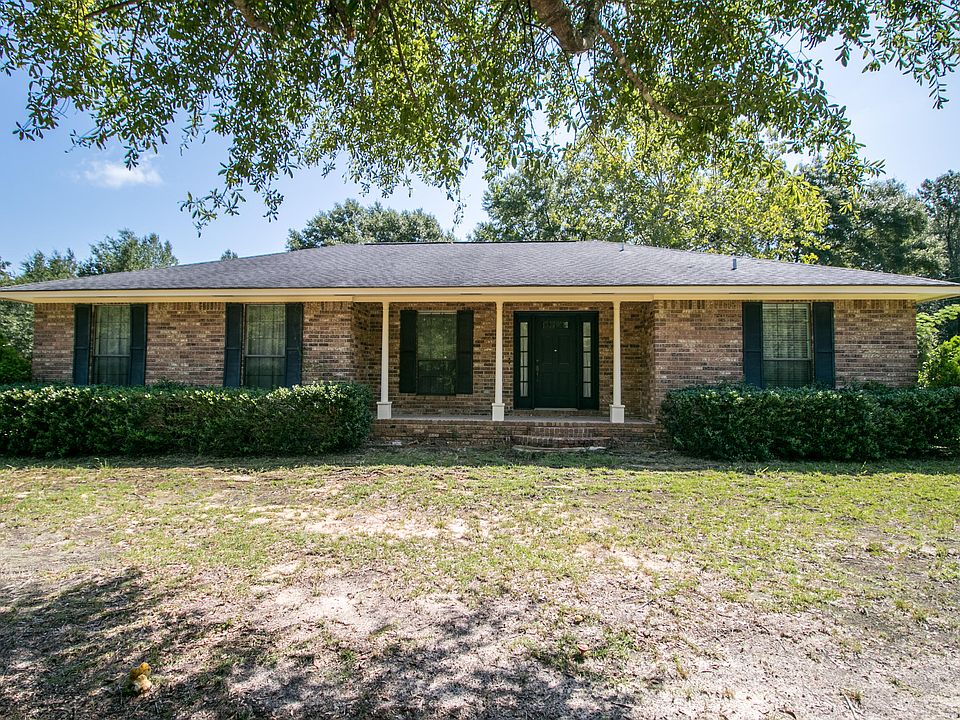HIGH AND DRY! This cozy home is just outside Mobile, AL sits on 1.67 acres, all brick for easy maintenance, over sized double car carport, single car garage, nice patio with pergola, fenced area for pets, large shop with roll up doors, beautiful magnolias, oaks, wisteria, and a variety of other plants. Inside, there is a cozy den with fireplace, large open kitchen with lots of cabinets and a pantry, formal living and dining rooms, large entry foyer, inviting covered front porch. Plenty of parking for everyone.