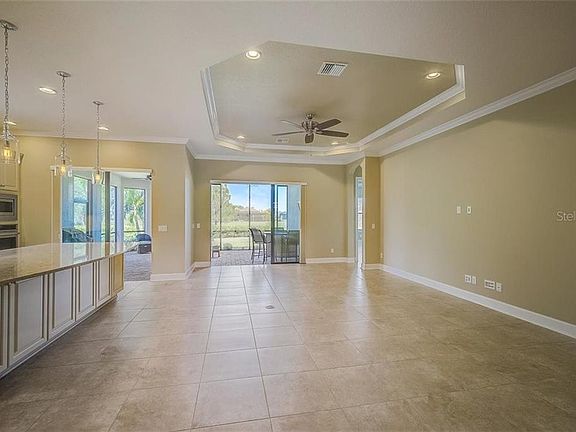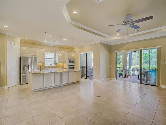 This stunning LAZIO floorplan will 'wow' you from the moment you walk in! Open concept floor plan with tray ceilings in the entry, living room, and master bedroom, crown molding thru every room. Upgrades throughout- including extended screened lanai complete with pavers, master structural bump out with additional windows, lighting in entry and dining, instant hot water heater, and so much more! You need to see it in person to truly appreciate the spacious bedrooms, relaxing view of the golf course, and immaculate kitchen. Recent designer exterior paint, freshly sealed pavers, pre-plumbed for an outdoor Kitchen, and also for pool (if you want to add) with a layout that will easily fit every lifestyle! Esplanade is an amenity-rich community with a full golf membership to an absolutely stunning course. Oversized garage, approx 2.75 cars! Spectacular Community pool and amenity center, playground, fitness center, fitness classes, fire pit, on-site bar and grill, wide street with plenty of room to drive a golf cart to the pool! Fully manned security gate 24/7- private streets and sidewalks everywhere- this neighborhood is situated in Lakewood Ranch, close to everything you could possibly need and a 30-minute drive to white sandy beaches! Don't miss out- schedule your showing today!
