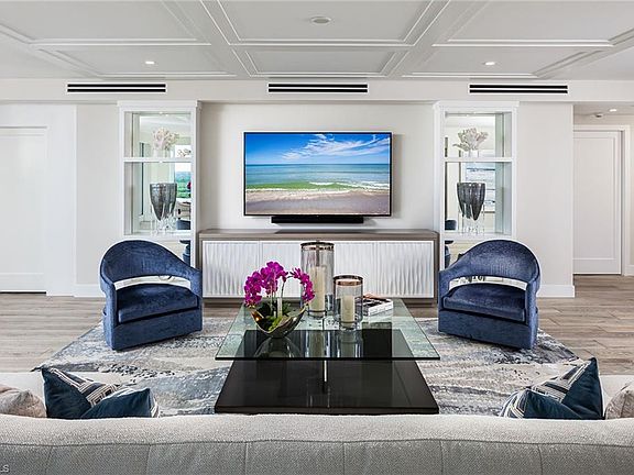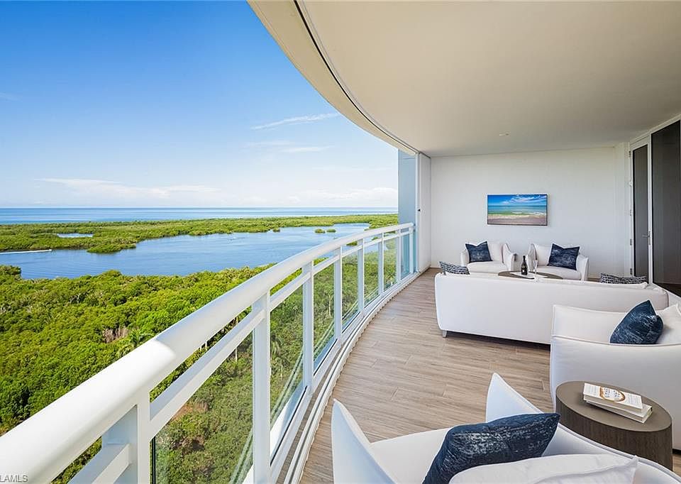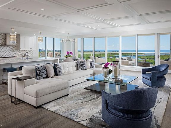 Built in 2020 & no storm damage! Enjoy spectacular sunsets from the 17th floor of this rarely available south-west facing end unit at Kalea Bay. Expansive floor-to-ceiling windows provide stunning panoramic views of the Gulf of Mexico and Pelican Isle Yacht Club. The private elevator delivers you to the professionally decorated home being sold furnished. Beautiful hand-scraped Legno Bastone wood floors, gourmet kitchen with Wolf and Sub-Zero appliances, quartz waterfall island, butlers pantry with custom cabinetry and Sub-Zero wine refrigerator, are just some of the many upgrades. All bedrooms feature en-suite baths and walk-in closets with custom built-ins. In addition to top-of-the-line impact windows and doors, the balcony has been upgraded with storm shutters to protect your outdoor furnishings. Enjoy the rooftop pool, social room, gas grills and open-air fitness. The Kalea Bay Club offers five-star resort amenities, wellness center, three pools, restaurants, pickleball, tennis, kids game room and overnight cottages for guests. Dont miss the opportunity to own a sensational property in one of Naples' most prestigious resort style communities.