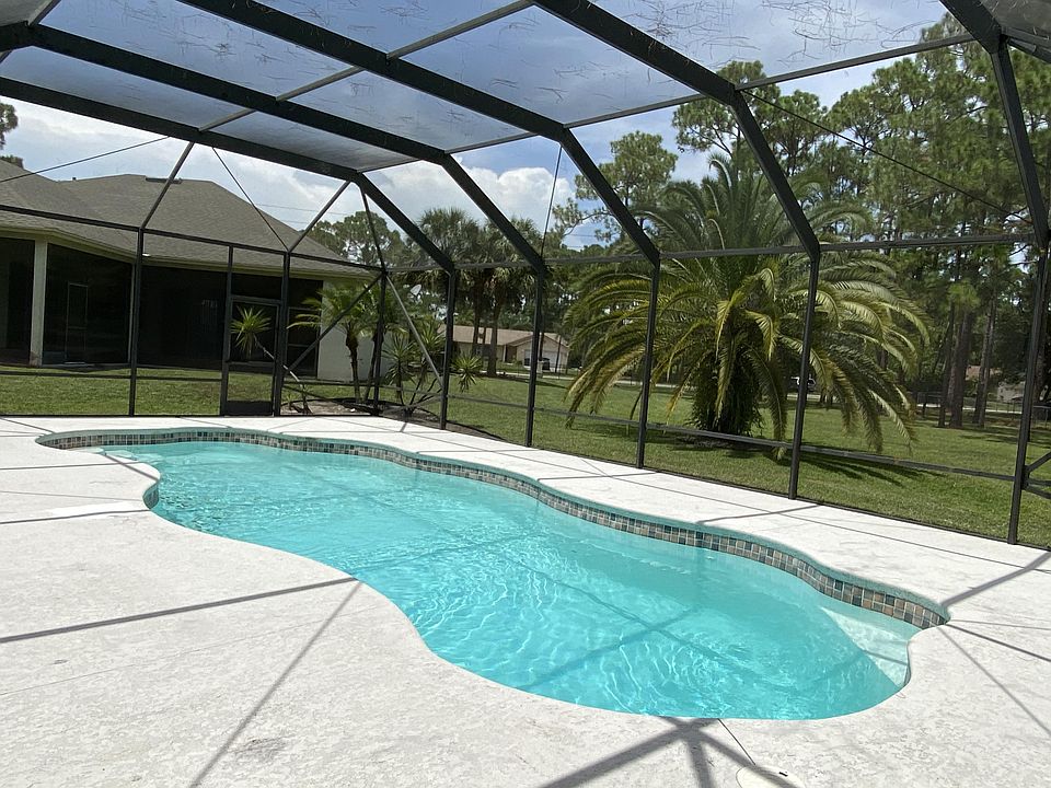 Beautiful 4 Bedroom 3 bath pool home. Sits on over an acre of land. Fully fenced in. Upgraded kitchen and appliances. Upgraded bathrooms. Split floor plan. Completely tiled. Vaulted ceilings. Half of the garage has been nicely converted into an office space/playroom area. Screened & Covered front & back patio. Bring your toothbrush here and come enjoy the peaceful sounds of nature while sun bathing in your very own beautiful screened in pool... This is a most see to appreciate!!