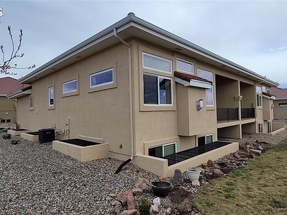 This beautiful end unit has a west-facing deck with tremendous views of Pikes Peak and the Front Range. This is an end-unit, with a delightful small park with benches right outside your door. - The kitchen features a beautiful bar/counter top that opens to the dining and living areas complete with a gas fireplace. - The Master bedroom features an exquisitely tall, tray ceiling, and connects to a large bath with a walk-in closet (9' x 8'). - The second bedroom on the main floor has beautiful double French doors and would be ideal as an office, den or of course a bedroom. - The basement features two more large bedrooms, one with a 9' x 6' walk-in closet. The large family room in the basement is open to the wet bar featuring a 12' countertop ideal for entertaining. - Lots of natural light and window treatments are included. - There are two storage areas under the stairs and a full bath in the basement. - Enjoy the convenience of location, the beauty of the Rocky Mountains, and the privacy and security of a gated community.