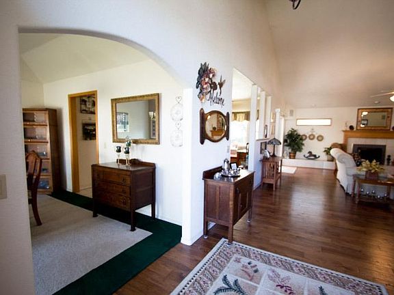 Looking for a home in the beautiful River Glen area? Here it is! Immaculate single-level with all kinds of custom upgrades. Wood floor in your entry and oversized living area. Enhanced with vaulted ceiling plus a pellet stove insert in custom fireplace. A large all tiled kitchen, floors and countertops, with built-in appliances breakfast bar and spacious eating area. Home includes bonus room used for office as well as formal dining with bay window and custom ceiling. Hardwood floors down hallway to 3 bedrooms, 2 baths and laundry rm. Spacious closets in all the bedrooms. Master bedroom with custom ceilings walk-in closet spacious bath with oversized shower. Fenced backyard with seven foot high concrete wall. Covered patio with ceiling fans and pass-through from Kitchen. Garage is extra large with area to tinker. All this on a corner lot move in ready!