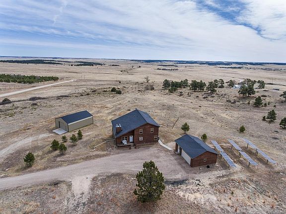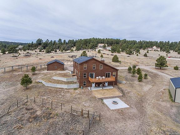 Just minutes from Kiowa or Elbert, in the sought after area of the bijou basin. Enjoy your evening under the stars by the fire pit, with endless views of the basin. With 20 acres you can have horses, and pets. With over 3700 sq feet finished, 5 bedrooms, and 4 baths, oak floors throughout main level, with plenty of cabinets in the open kitchen. The main floor master makes this floor plan work for all ages and guests. VPN connection available for those who work from home in the study. A 30x40 outbuilding with concrete floors, electricity and workbenches is perfect for the hobbyist or mechanic in your family. Don't be intimidated by the electric heat on this home. The owned 9KW solar system gives this home very low energy costs, almost no maintenance, and no propane bill. High capacity whole house attic fan keeps home cool in the summer. The 2 car detached garage is close enough if you wanted, you could build a breezeway. Take time to watch for the Elk herd and the flock of wild turkeys.