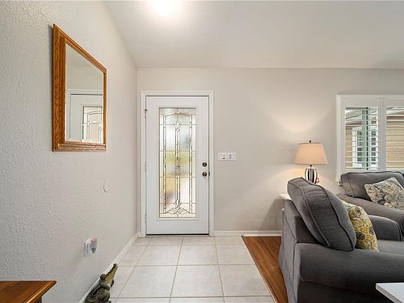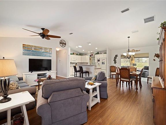 RUN to see this wonderful home in Del Webb Spruce Creek Golf and Country Club! It not will be on the market long! The model is the Chesapeake; 2 Bedroom, 2 Bathroom, Living Room, Dining Room, open concept Kitchen with a finished Family Room (10 x 20) that opens onto a wonderful entertainment area within a birdcage (10 x 20) with a Sunbrella-type awning - wired for TV and currently has a 4 month old Caldera Spa! There is also an Office that has a built-in desk and file cabinets and also a solar tube for added light, as well as built-in shelving for added storage and a coat closet. This home has everything: Full interior and exterior paint in 2019, New HVAC in 2017, New Roof in 2014, and all NEW LOW-E windows throughout the entire home in 2020. Also, in 2020 the driveway, sidewalk, front porch and birdcage floor were designer painted. All inside hardware has been changed to brush nickel. Both bathroom showers have been beautifully redone! Both bedrooms have walk-in closets. The center of the home has cathedral ceilings and the kitchen has a breakfast bar island with a solar tube that has a night light! Brand new Plantation Shutters (2020) throughout and brand-new blinds in the family room in the back of the home. The Kitchen boasts bisque cabinets and appliances (Kenmore) and the refrigerator has French doors. There is a closet pantry in the Kitchen. The Kitchen sink is new composite, with a new garbage disposal and new faucet. The newer washer and dryer are also Kenmore and sit next to a utility tub in the extended garage (20 x 24), with sliding privacy screens. Finally, the backyard is private and is lined with beautiful crepe myrtle trees that bloom FUCHSIA. Beyond the yard is pasture. The front yard has a solar lighted flagpole as well as concrete curbing around all planting beds. The amenities at Del Webb are superior to others in the area and boast 3 swimming pools, 3 hot tubs, a state-of-the-art Fitness Center, massage therapist onsite as well as personal trainers, 4 9 hole golf courses, pickleball and tennis courts, nature trail, softball field, horseshoes, bocce ball, shuffleboard and over 100 clubs! Come check us out today!