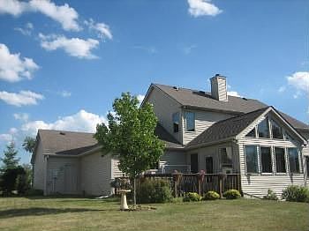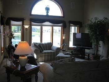 Listing agent: Judi, Phil and Brad Stinson, Call 260-469-1947 for information. Custom built one owner home - Overlooks 2 ponds - Steve Fredrick Builder - 6 wall construction ? Entry foyer with wood flooring and 2 story entry enjoys views of the window walls that accent the Great room. 3 Way gas log fireplace enhances the views into the kitchen. Wonderful Madison custom cabinets with staggered cabinetry heights, open soffits, island, Black appliances will stay and include Refrigerator, smooth top range/oven, Dishwasher and disposal -Specialty features include ceramic back splash, appliance hideaway with doors that fold back to show entire area, pull out shelves, large silverware drawer, lazy susan, vertical dividers, spice rack and closet concept 6 ft pantry too. Finished daylight basement, plumbed for a future wet bar. A 2nd staircase walks down to a work shop from the garage area. Stereo speakers are featured on the 1st floor and lower family room. The 1st floor Master has cath ceiling w/fan & light and window walls make it light and bright. Special light switches by the bed for turning off lights. Spacious 7 ft vanity with double sinks, built in medicine cabinet, 2 person jet tub and separate shower and stool area - Spacious walk in closet 9x8 with closet tamer shelving including a jewelry drawer. On the upper level there are 2 bedrooms and spacious bath plus a walk in to attic storage.