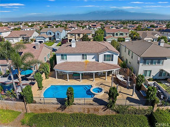 Now is your chance to own a highly desired Two Story Pulte home in the Community of Brookdale Terrance in Eastvale that is on the market for the first time. A rare opportunity, no neighbors behind you, breathtaking view of the Santa Ana River, City lights and Mountains for miles. Soak up the sun in this private rectangle in-ground lap pool with shear waterfalls, relax and unwind in the spa, Oversize half-moon built-in barbecue that is perfect for entertaining, decorative metal gazebo with pillars, roman inspired wood patio that is the whole length of the first level, and low maintenance backyard. As you step inside you will notice the high ceiling in the entryway, sparkling oversize crystal chandelier, Living room, formal dining area, generously sized family room with fireplace that is adjacent to the spacious kitchen that has ample amount of space, granite counter, today's popular white cabinets, kitchen island with kitchen sink, double oven, recessed lighting, plenty of counter space and cabinets, walk-in pantry, dry bar with cabinets, individual laundry room, secondary stair case conveniently located near the family room and the kitchen. This Six bedroom (1-First Level Bedroom), Four bathroom (1-First Level Bathroom), two separate driveways to the three car attached garage gives you approximately 3375 Square Foot of living space. The second level has luxury wood like plank flooring throughout, wide hallway, unique layout with larger bedrooms, Jack and Jill bathroom, Tranquil view from the primary bedroom, dual sinks, standing walk-in shower, soaking tub, and walk-in closet that can accommodate large wardrobes in the primary bathroom. Centrally located near all major freeways, walking distance to the Eastvale trail, short drive to Silver Lakes Sport Park that has events year around, close to shopping and restaurants. Don't miss out on entertaining poolside in this Eastvale Home.