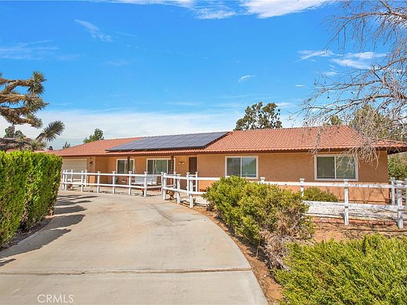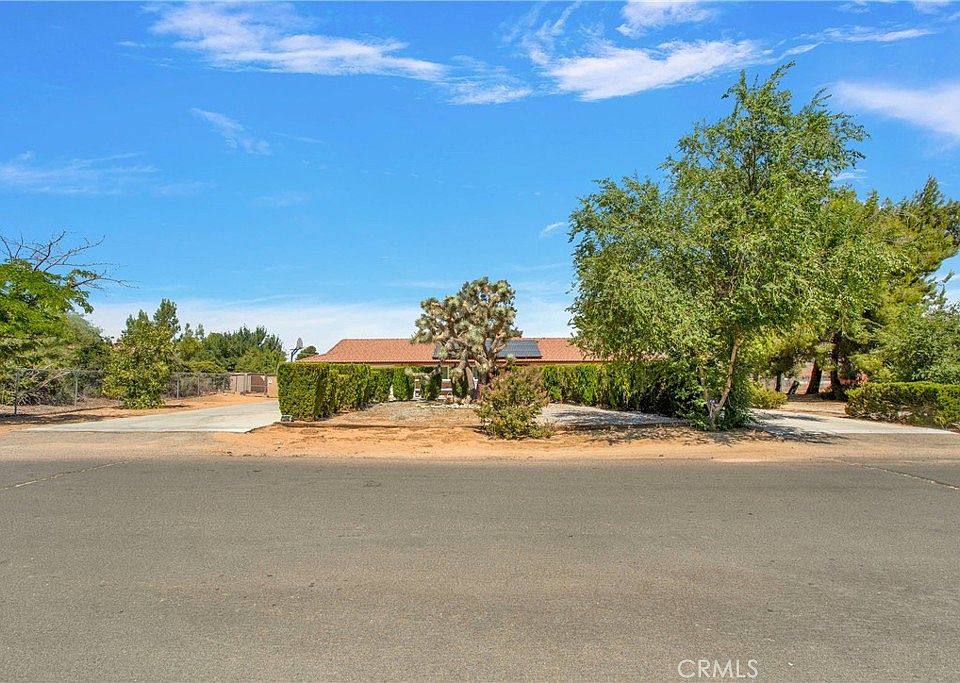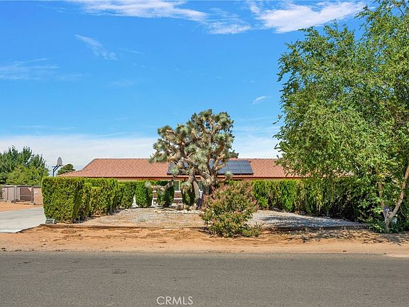 Beautiful Home on a Large Lot with a detached RV Garage/Warehouse! As you approach this beautiful home you are greeted by multiple mature trees lining the circular driveway. At the entry is a peaceful front porch with swing. As you enter you see the open floor plan expand through the Living Room and Kitchen opening up through the sliding glass doors past the fireplace to the rear yard. The Kitchen is accented with granite counter tops and a nice breakfast nook! Down the hall to the bedroom area you find that almost every room has ceiling fans and mirrored closet doors as well as window coverings. The bathrooms also have granite countertops and the Master Suite has 2 closets (1 a walk-in) as well as a Spa-Tub and sliding glass doors to access the rear yard as well. On the other side of the home there is an Office/Formal Dining room for your purposes. The deep 2 car attached garage with new door and opener has built-in storage shelves and cabinets and is set-up for a central vaccuum system. The laundry is located in the garage and has hook-ups for multiple types of machines. There are RV Access gates on either side of the home accessing the huge rear yard. Out the sliding glass doors from the kitchen you find a large, covered patio / entertainment area. Additionally, the rear yard houses an animal kennel area with 6-7 fenced kennels as well as an RV Garage that has multiple doors for your creative imagination to run wild! There is an easement across the rear of the property with an additional rear access. Close to Shopping, Restaurants, Apple Valley Airport and Brewster Park which hosts its incredible 4th of July fireworks show and many other events. With all of this and ample room to continue adding an ADU or Swimming Pool paradise~ (check with the City!) All on an Affordable Solar System, the possibilities are endless!