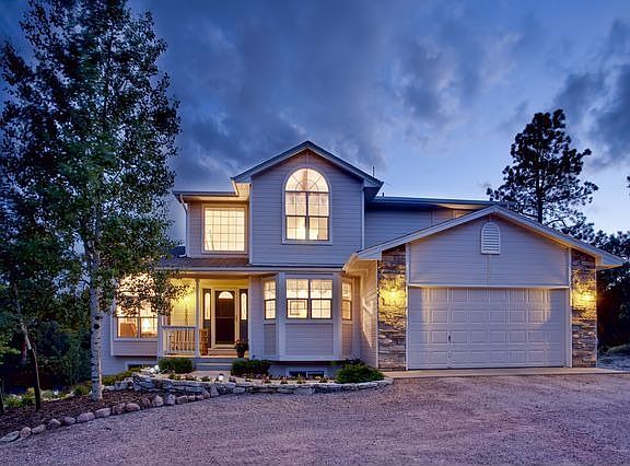 In Black Forest, awake to a beautiful view of Pikes Peak and the delight of birds singing. Enjoy the seclusion of mature trees on 5+ acres, with a forest view from every window, and be surrounded by custom landscaping. Wonder among trees with hills and meadows all on your own private property. Sit and enjoy the peace and quite as the leaves move in the breeze and watch the wildlife stroll through. Exterior of home is all professionally landscaped with stone walk paths, many flowers and plants in perfect bedsMany many mature pine and other trees and a small lawn area if you just need to have your feet on grass. There is an underground sprinkler installed. Perfect vantage points ranging from an upper deck off the master bedroom with Pikes Peak views, to a lower deck with newer Sunsetter awning, fine flagstone patio, and many sitting areas around the property allowing you unlimited outdoor enjoyment of your home. Property is completely fenced with an automatic gate for security. Plenty of room to park the largest of RVs. The house itself is high quality. 2 x 6 construction means a tight well insulated home for great comfort summer and winter. The exterior has been recently painted. The siding is extremely durable HardiePlank for maintenance free living. Cabinets in the kitchen are upgraded with pull out shelves and special functions. Many electrical outlets mean you will no longer need to run extension cords. Other great amenities are - green house, large bay windows, fully insulated garage, walkout basement, jetted garden tub in master bath.