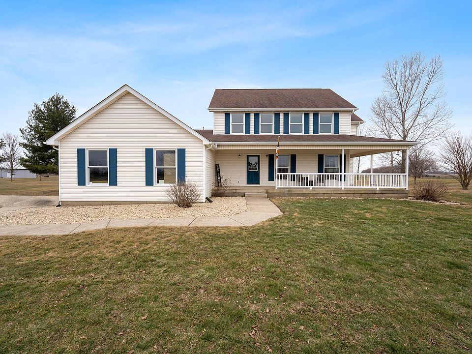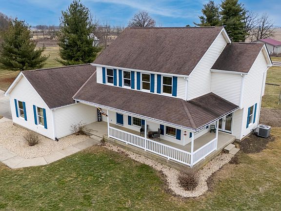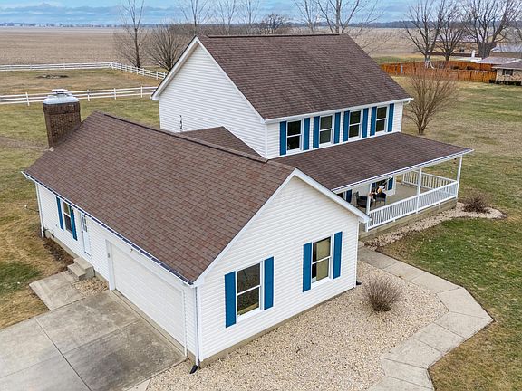 Looking for A Big Home? Land? Existing Outbuilding? Big Patio? Wrap Around Porch? You've found it here! This beautiful 2,280 sq ft home sits on over 4 acres and is big enough for a large family to spread out and have their own space. On the main level there is a kitchen and dining area and an additional room with three walls of windows that can be used for a formal dining area, playroom, home office or homeschool room. There are two separate living rooms and a beautiful fireplace. There are four bedrooms and two bathrooms upstairs. An attached two-car garage. A large, unfinished basement. Huge patio on the back of the house for large gatherings or watching the sunset over the acres and acres of farmland. Or sit on the wrap around porch and enjoy the views of country living.