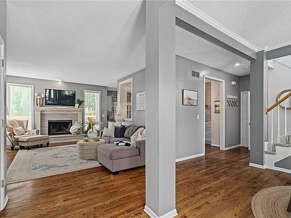 Welcome to your dream home in the desirable Blue Valley School District! This stunning 2-story residence boasts updates galore. The exterior shines with fresh paint, custom black shutters, and new outdoor lights. Inside, the kitchen is a chef's delight, featuring quartz countertops, a stylish tile backsplash, new fridge, dishwasher, and a sleek SS farm sink. Enjoy the luxury of a SS vent over the cooktop and beautiful hardwoods on the ground floor. Step out through the French door to a deck and patio enclosed by a new wood privacy fence. Additional highlights include a brand new tankless water heater, newer high-efficiency HVAC, a spacious master bedroom with vaulted ceilings, and a master bath that dazzles with a double vanity and a uniquely designed decorator-tiled shower. Upgraded bathroom lights, new stair carpet, and a serene cul-de-sac location add to the appeal. The lower level surprises with a playroom, fitness center, and a storage room with built-in shelving. A new sump pump with battery backup and a new garage door complete the package. Don't miss this exceptional home!