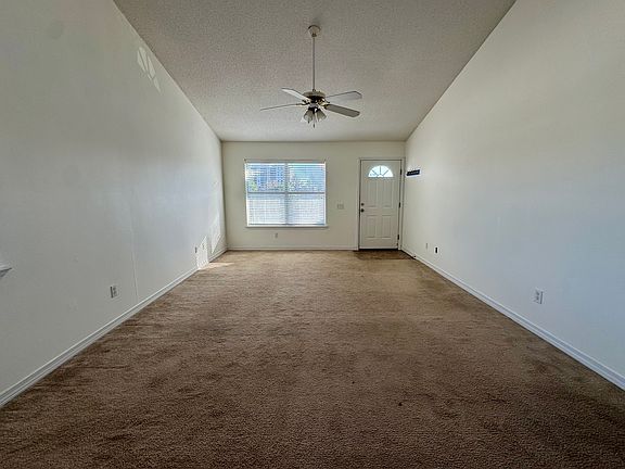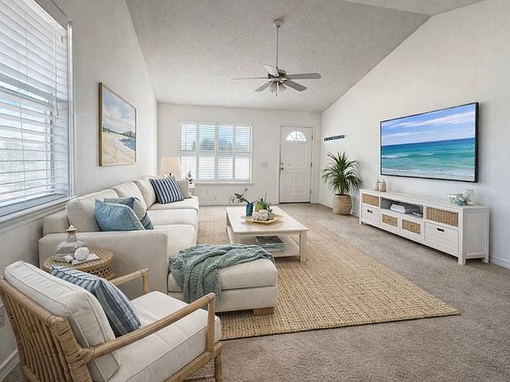 The living room boasts vaulted ceilings, filling the space with natural light and giving the home a bright, airy feel. Both bedrooms include ceiling fans and ample closet space, providing comfort and functionality.