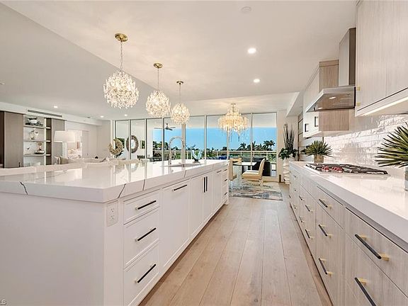 Welcome home to unit 302 in Tower 400, recently completed and beautifully finished, this Kalea Bay residence provides all the conveniences of living in a brand-new luxury condominium and a 5-star amenities center, a combination that has made Kalea Bay one of the most successful and desirable communities in Naples. This residence features a wall of sliding glass doors leading to a unique expansive extended terrace totaling 1,242 square feet including 523 square feet of covered outdoor living plus 719 square feet of open balcony area. The interior of the unit lives like a single-family home with 3,290 square feet of living space including 4 bedrooms and 4 full bathrooms including spectacular primary suite with a massive custom closet. Highlights include stunning wall decor throughout plus impressive built-in units in the great room and the media room including back-lit wall panels that can be dimmed for movies. The lighting fixtures are fabulous and eye catching as you enter the home and accentuate the finishes including wide plank oak wood floors, custom cabinetry and designer touches throughout the home. The open gourmet kitchen features a Wolf gas cooktop and wall ovens, Sub-Zero refrigerator and full height wine cooler and a butler’s pantry with ample storage. The building features a rooftop terrace with a pool and spectacular sweeping views, an open-air fitness center, BBQ grills and an open-air lounge all ideal spots to take in stunning sunsets. Tower 400 is located directly across from the Club at Kalea Bay and provides easy access to 80,000 square feet of exceptional modern amenities, including a wellness center with a state-of-the art gym, spin room, Pilates, spa services plus 3 resort style pools, 2 open-air poolside bars, fine and casual dining options, outdoor fire pits, a kids’ game room, 8 pickleball and 4 tennis courts, guest cottages and more. Kalea Bay Residents also have the option to join the annual Beach Card Program, based on availability, which grants access to the private Beach Club at Moraya Bay at Vanderbilt Beach for dining both indoor and outdoor as well as beach service including food, beverages, chairs and umbrellas.