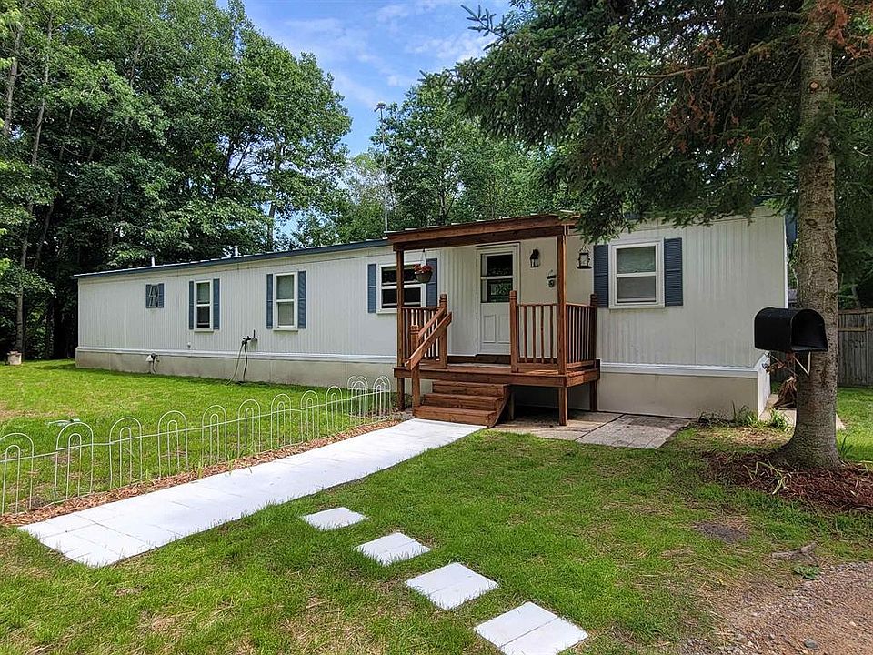 Completely move in ready and affordable! That is a combination hard to find in this market. Tucked almost at the end of a private road you'll find this picturesque lot on a bluff above the Tittabawassee River that leads into Wixom Lake. The hillside is beautifully wooded and creates a private feeling. Accessing the river is made easy by the private beach for neighborhood use only. Perfect spot to take a swim or kayak. Even with Wixom Lake dam under repair there is water in the river to enjoy now! This 4 bedroom, 1 bath singlewide has been remodeled inside and out with the utmost attention to detail. Originally manufactured in 1978 this qualifies for FHA & Conventional financing. There is an inviting front entrance with a paver sidewalk and large, new front porch. Step inside and you'll be greeted by recently refinished, gleaming hardwood flooring in the living room & hall and first bedroom. The spacious eat in kitchen has ceramic tile floors and plenty of cupboards and counter space. Convenient snack bar offers extra seating and a spot to grab a snack. With 4 bedrooms (3 have new carpet) there is room for the entire family. Don't need 4 bedrooms, the 4th steps out to one of two back patios and would make a great family room! The bonus back entrance room would be a nice home office or large space for coats & shoes and other additional storage. Recessed space off the hallway for washer & dryer hook up. Refreshed full bath with a tub & shower. Vinyl windows and drywall throughout. Enjoy all the updates from new flooring, fresh paint, newer water heater, power washed exterior, new patios & porches, gravel driveway. Updated well & septic. Fenced yard on 2 sides. Close to state land and trails making this a great up north get away too! Take a look today.
