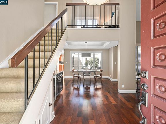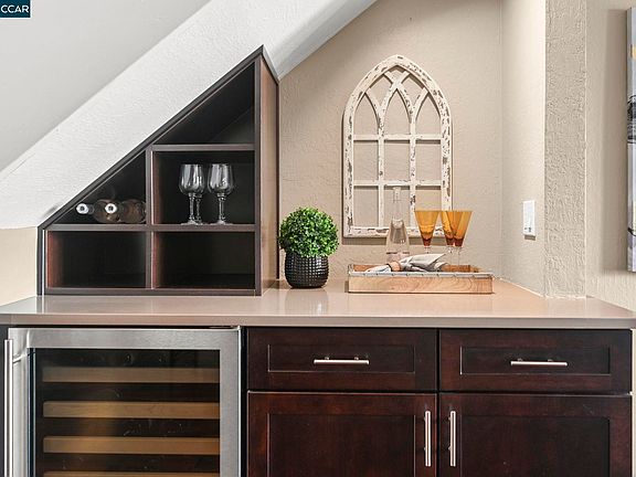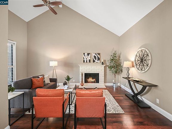 As you step inside this stunning townhome, you're immediately greeted by designer lighting fixtures, vaulted ceilings, and luxurious walnut engineered hardwood flooring. The expansive living area features a bar area with a built-in wine fridge, a cozy fireplace, a ceiling fan, plantation shutters, and a dining area that overlooks the private rear patio. Conveniently located on the main level, the primary bedroom suite boasts a renovated bathroom with a tiled shower, a dark wood vanity with double sinks, and a quartz countertop with modern fixtures and finishes. The spacious kitchen has been beautifully upgraded with maple cabinetry, a pro-style KitchenAid gas range, under-cabinet lighting, an included LG refrigerator, and a handy center island. A two car attached garage opens to the kitchen and has an included washer/dryer. Upstairs, you'll find a bedroom with vaulted ceilings and a bathroom that has been stylishly updated with a modern vanity, lighting, and tile flooring. A loft area overlooking the living room provides the perfect space for a home office and could also be converted to a 3rd bedroom. A finished, walk-in attic area off the upstairs hallway offers abundant storage options. Perfectly located convenient to freeway, BART, Canal Trail, and Heather Farms Park.