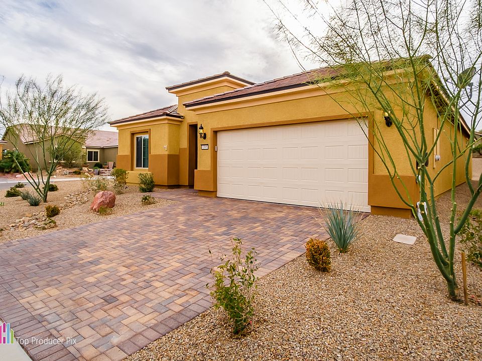 This fabulous Sun City Mesquite Haven has over 60k in upgrades. SID PAID IN FULL!! You will love the open design of this home which is becoming one of the favorite Sun City models. The wood-grained tile flooring is stunning. There is a floor outlet in the living area. The gourmet kitchen is set-up for cooking. It includes unique large counter-height granite island with overhead pendants, stainless appliances, and large pantry. Updated faucets, showers, 3/8" glass in master shower, and new granite countertops in both bathrooms. Enjoy outdoor living from one of the many outdoor spaces. Great upgrades including pavers in the driveway, walkway, interior courtyard and back patio. Custom pergolas that provide additional shade. Fully landscaped. The garage has a 2' extension, additional lighting, and electrical outlets. Better than new with ceiling fans, window blinds, and pendants already installed. This location in Hickory Wind is ideal for anyone who wants to be close to the Sun City Pioneer Center. Start enjoying all of the Sun City Mesquite amenities and lifestyle, today!